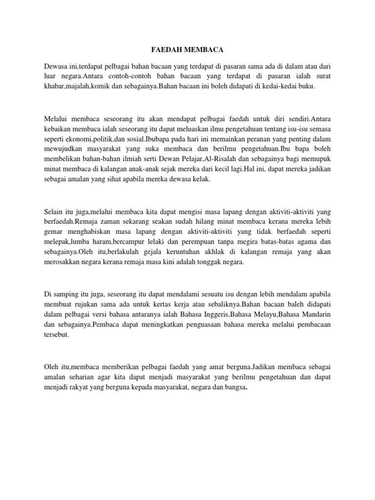 Contoh karangan faedah membaca موضوع المقالة. Sebagai seorang pelajar kita perlu memupuk minat membaca untuk menambahkan ilmu pengetahuan dan mendapat keputusan.